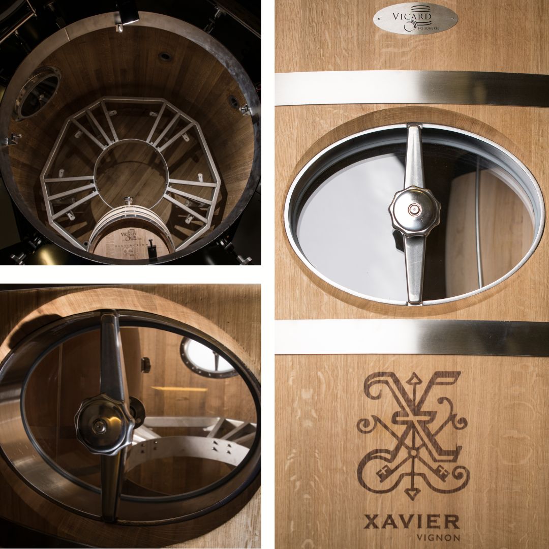 We also blend different materials using containers made of oak, stainless steel, glass, or concrete. Our approach to wood, especially in light of climate change, has evolved significantly since 2012. We aim to age wine in the most favorable conditions possible, shielded from oxygen. The solution? The unique “vin dans le vin” or “wine within wine” aging method. It involves submerging custom-made 160-liter barrels, crafted with thick staves, into a wooden truncated cone vat. This extraordinary method is not only visually stunning but also revolutionary. The wine remains in an impeccably balanced environment with no external exchange, free from temperature, pressure, oxygen, or even electrical tension fluctuations. The absence of oxygen also means the wine needs far fewer sulfites. As a result, the aging process is extended, and the wines stay fresher for longer.