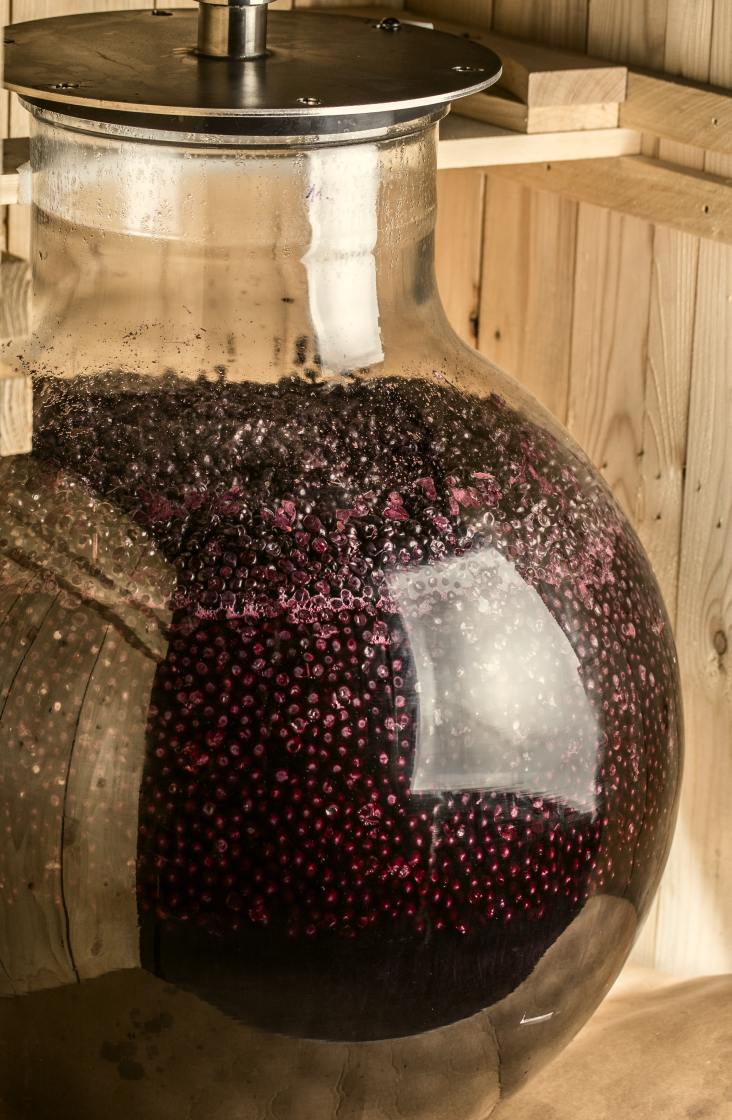 Il joint à cette maitrise des procédés innovants qu’il a lui-même mis au point. Le temps, moteur de création, est pour lui essentiel, de même que la variété des contenants employés et surtout la recherche de la pureté maximale des jus, dans une atmosphère anaérobie totale.
